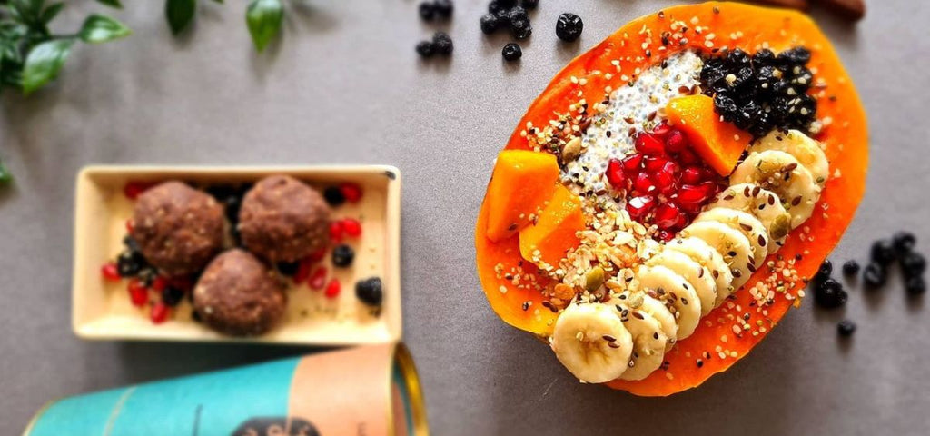 Use one of the papaya halves to load up all the different ingredients listed and top it off with some hemp trail mix and hemp hearts. This is the simplest dish you can and it also super tasty, delightfully nutritious and refreshing. Recipe Contrinuted by Neha